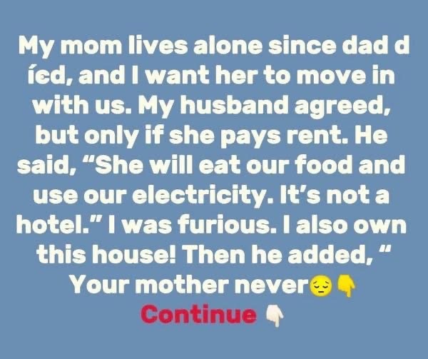 Yes, you read that right. Rent. In a house we already own and don’t pay rent on. Let the laughter—or sobbing—begin. His reasoning? “Your mother is a leech,” he said with a smirk that I can only describe as villainous. “Once she moves in with us, she will never leave.”